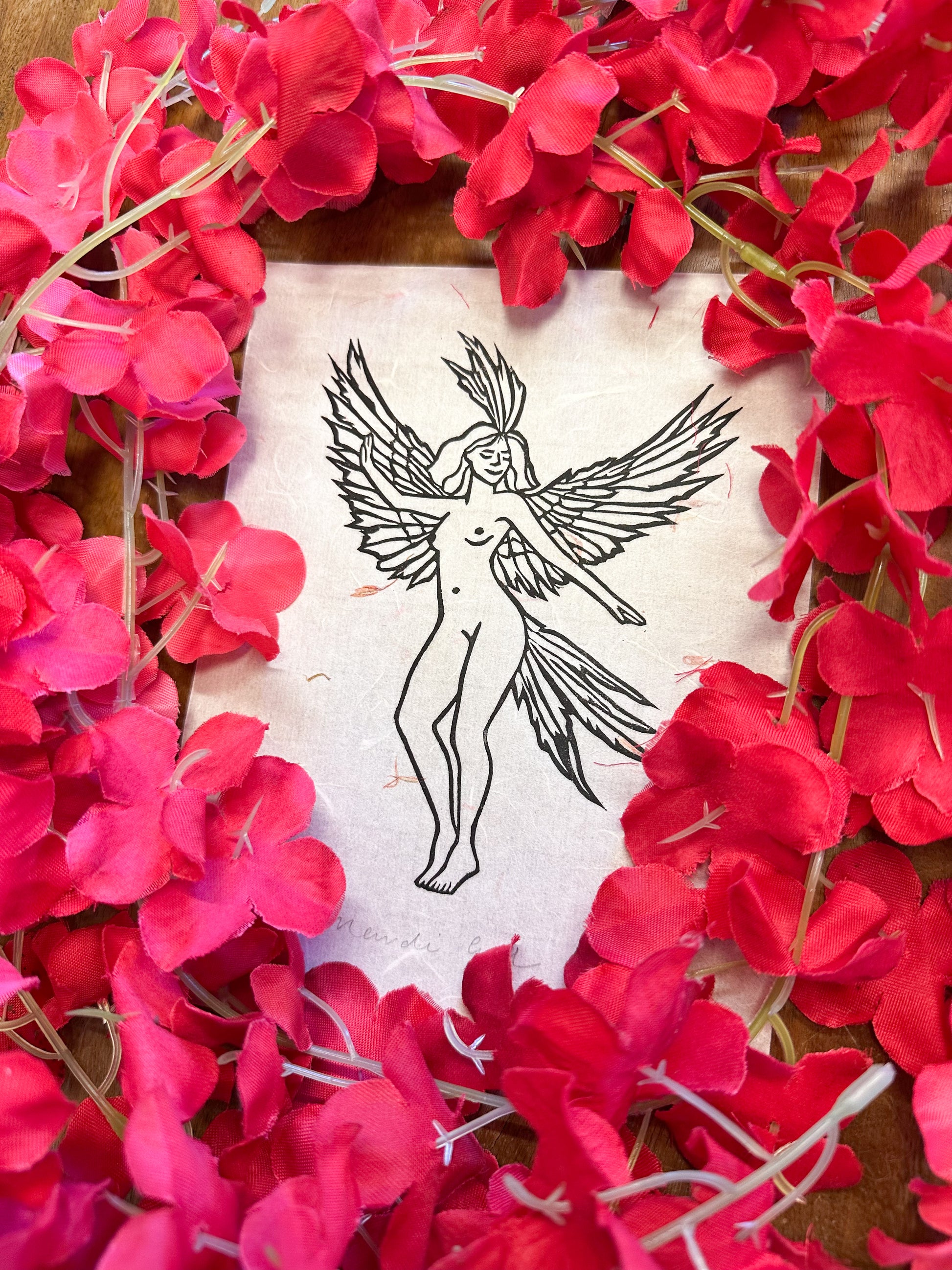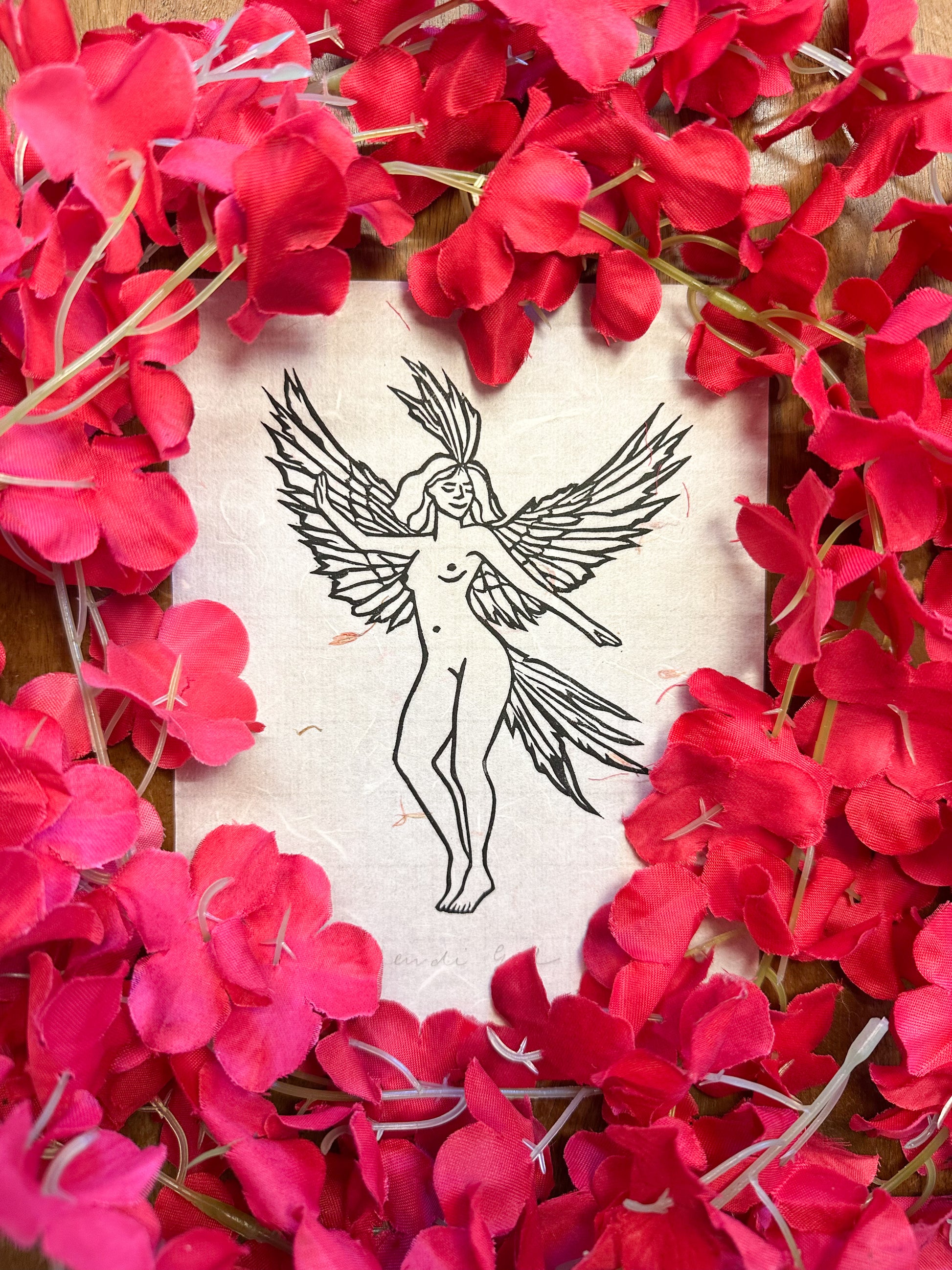 Mardi-Gal celebrates joy, freedom, and the wild abandon of dance. This hand-printed lino print features a dancing nude woman adorned with feathered wings, crest, and tail - an ode to carnival spirit and feminine power.